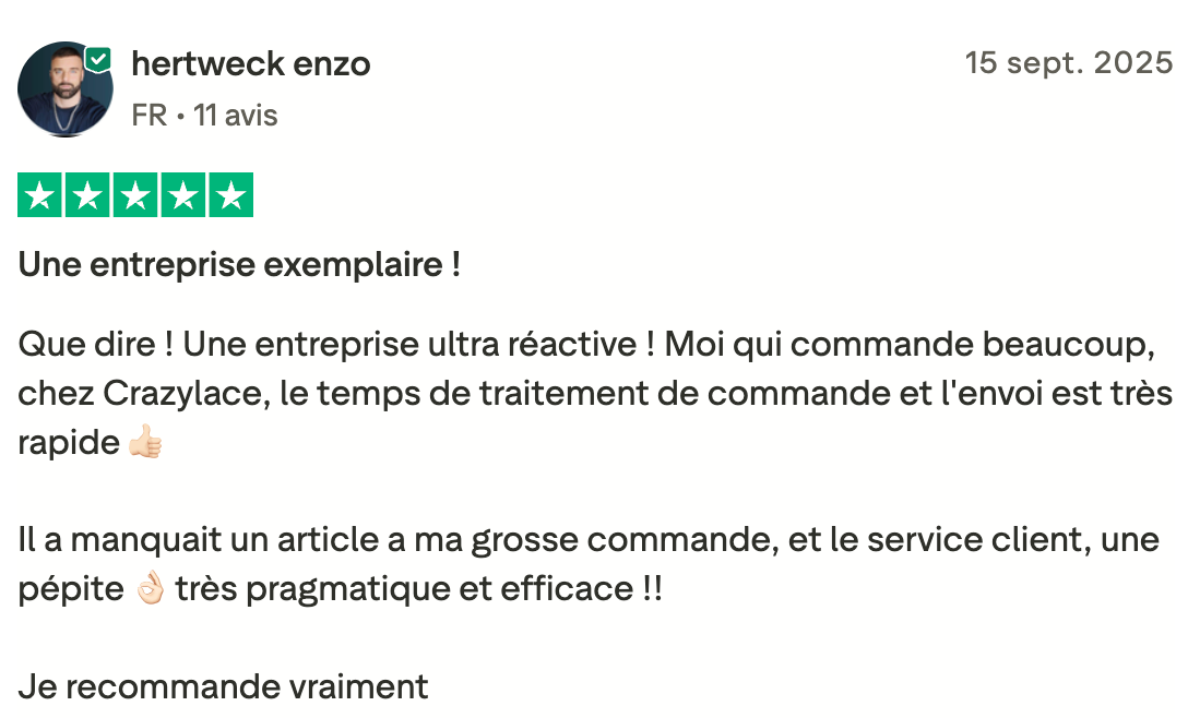 Chez Crazylace France les avis et les étoiles sont authentiques et vérifiés. Chaque témoignage provient d'un vrai client sastifait.